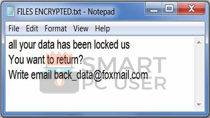 While encrypting the data, the ransomware changes the name of each file. For example, If you have a file named XYZ.jpeg, After encryption, it is renamed similar to “XYZ.jpeg.id-1E857D00.[back_data@foxmail.com].rxx“. It shows you a pop-up like “FILES ENCRYPTED.txt” after completion of the process.